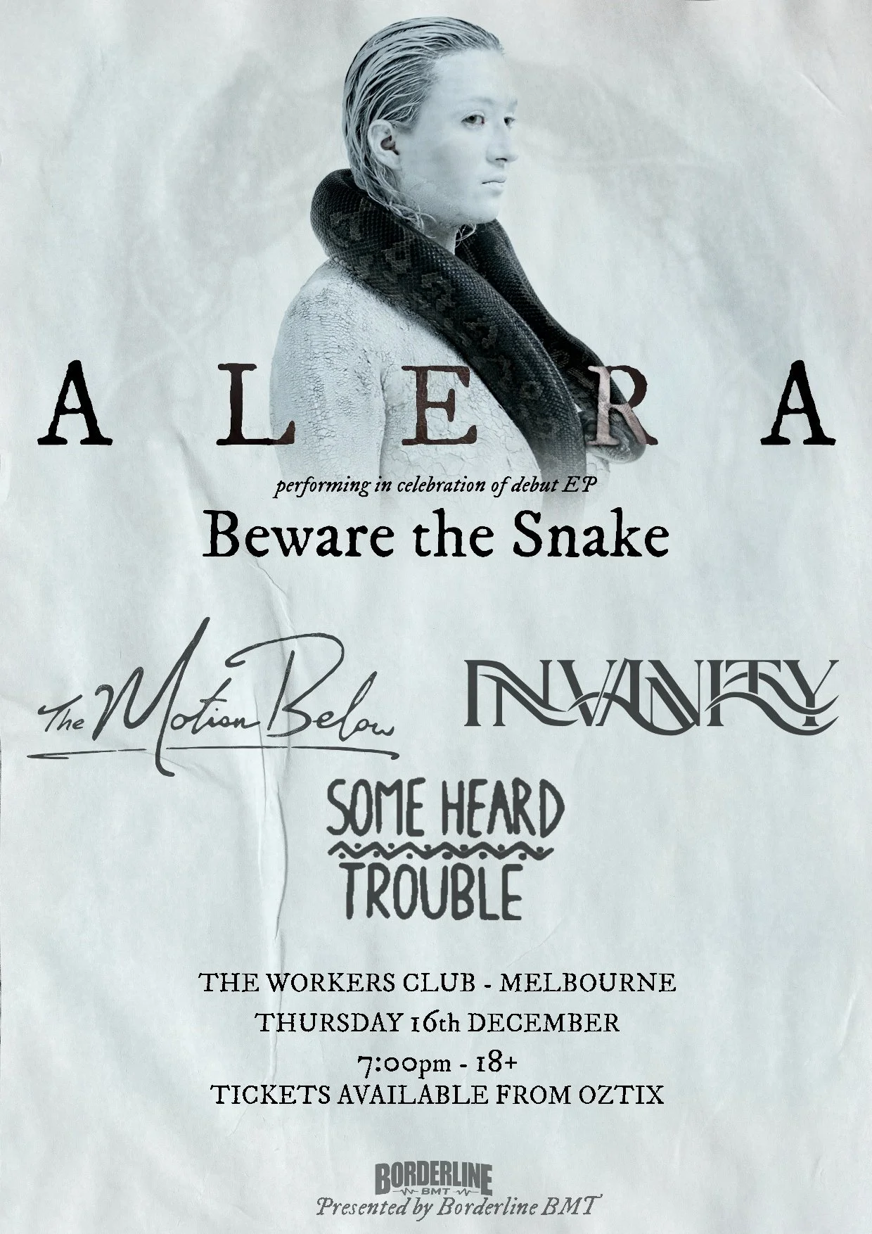 Having already clocked tens of thousands of streams on its singles, Alera's forthcoming 'Beware The Snake' EP has enabled Alera to develop a narrative as well as a community around their conceptual art in a way that is redefining how music is able to tell a story. There is a rich and immersive experience the viewer is invited to enter through cryptic puzzles and the mysterious Covenant which acts as a backdrop to this band’s melodic, anthemic, and at times chaotic music.