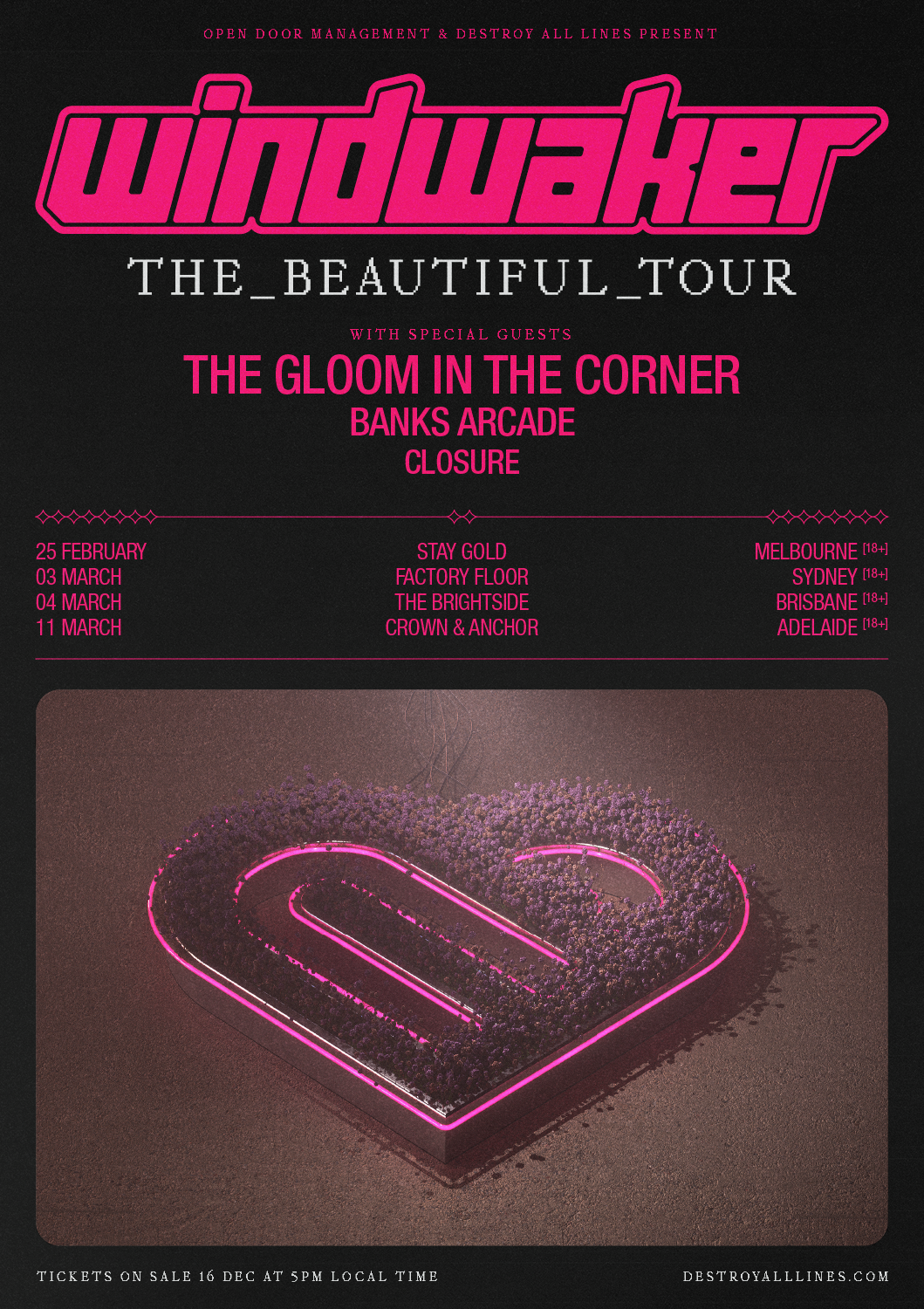 Reflecting on their ambitious beginnings out of Auckland just a handful of years ago, vocalist Joshua O’Donnell shares that the first lyrics the group penned together were “I always wanted to make history”. Heard on the single they would eventually title ‘Ambition’, this sentiment has carried through in every highly considered creative move the band has made since. From their compelling visuals and stage presence to their boundary-pushing sound, this history-making urge is evident from all angles of the Banks Arcade camp.