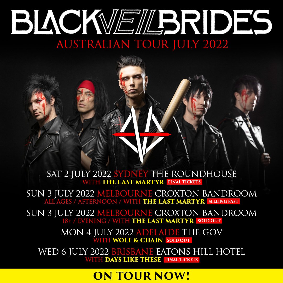 Australia, BLACK VEIL BRIDES Australian tour kicks off this week! Tickets for their Australian headline tour are flying out the door. With Adelaide and Melbourne's 18+ show sold out, the tickets for Melbourne's all ages show are selling fast and final tickets remaining for Sydney and Brisbane.