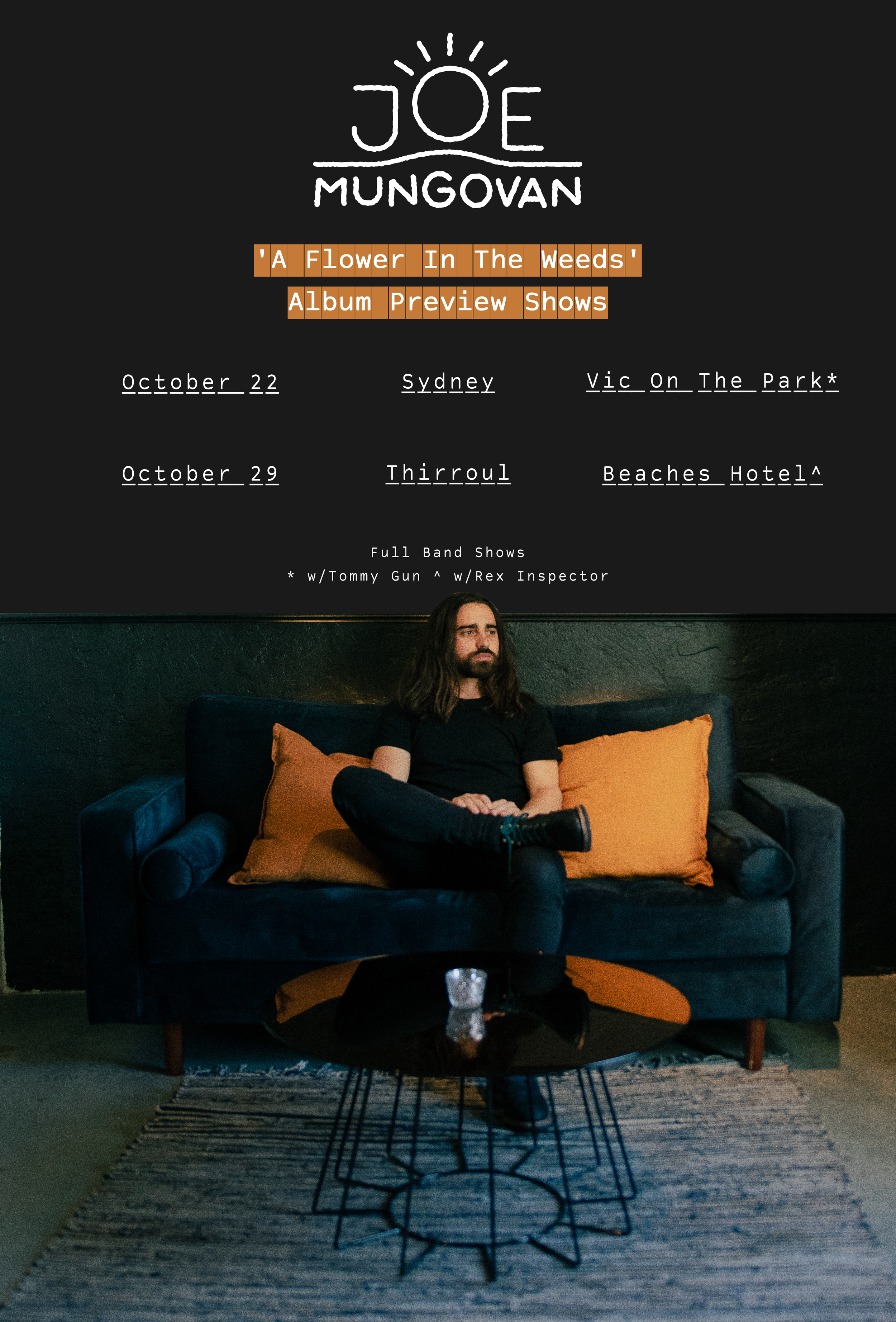 “ I initially planned on touring the album with a full band through November and December. The second lock down hit, I quickly realised that I would have to reschedule those shows, but I still wanted to play some gigs and give people live music. The idea of ‘Breakfast With Joe’ was born. On the week the album drops I will hit the road and travel up the east coast playing at a different cafe each morning. I have chosen some beautiful spaces with big outdoor areas so bring your picnic rug, get your almond latte orders in and enjoy a morning of live music and smashed avo.” Joe Mungovan