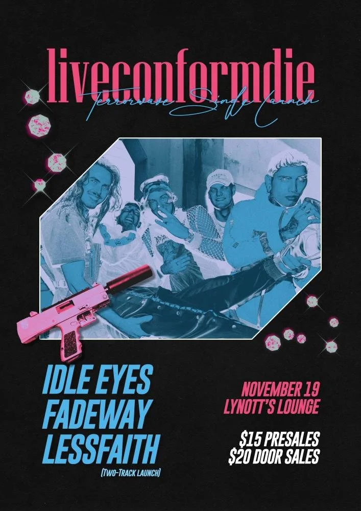 Now with almost 5 million total streams on Spotify alone, liveconformdie are levelling up again with their new single "Terrorwave". The new single is out now and the launch show happens in Perth, WA, on Friday November 19 at Lynotts Lounge with Idle Eyes, Fadeway and Lessfaith! Tickets went on sale 9am AWST Friday October 22 at Oztix.