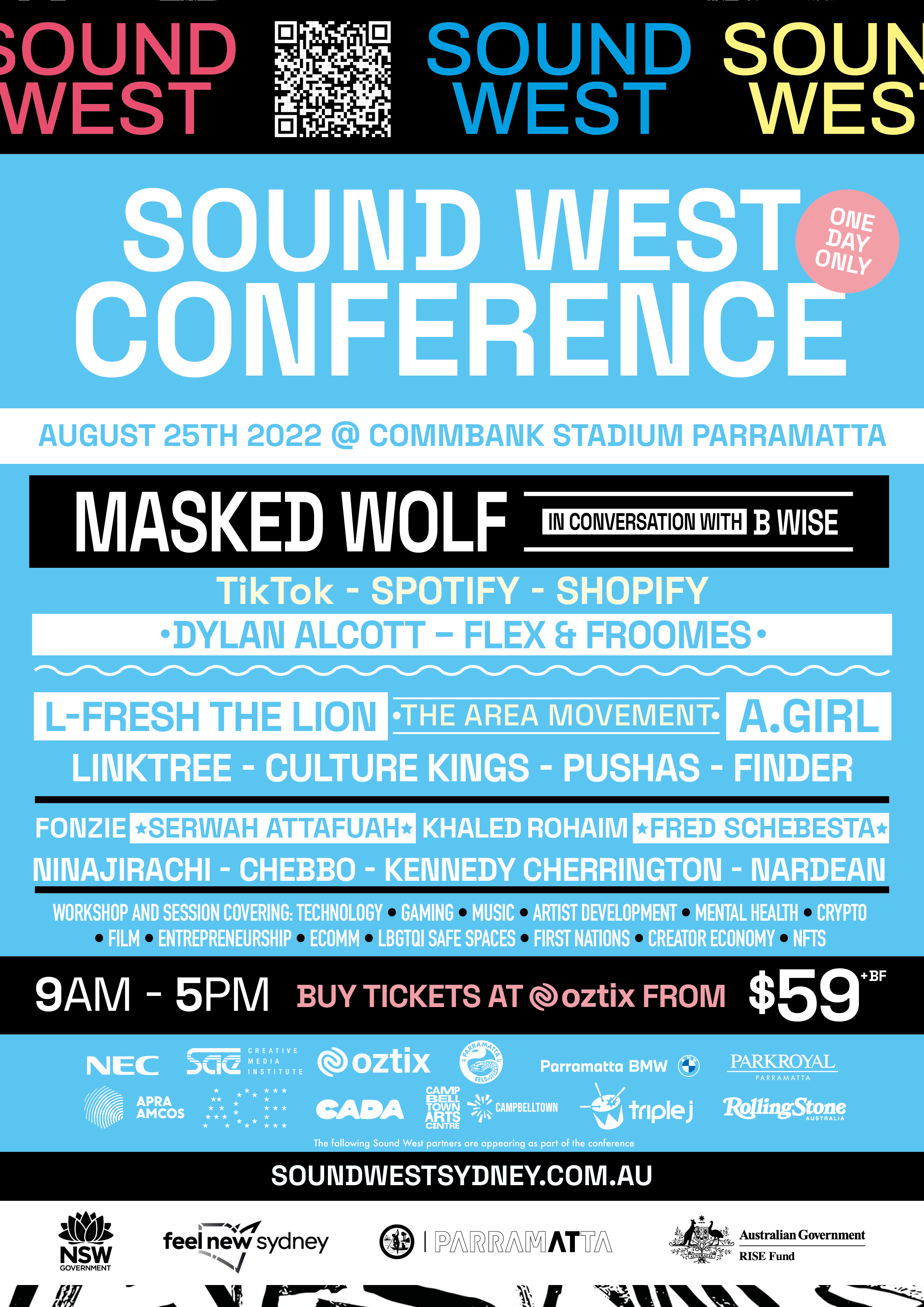 SOUND WEST recognises the immense talent in Western Sydney, Australian rapper Masked Wolf will kick off the live events on Saturday 20th August 2022 at Saturday Sounds x Sound West, presented by the Parramatta Eels at CommBank Stadium. The conference will feature sessions and workshops with hip hop artist and producer L-FRESH The Lion; Australian musician, singer, songwriter and rapper A.GIRL; and musician, poet and rapper NARDEAN as well as songwriters Khaled Rohaim and Styalz Fuego, and acclaimed NFT artists, Serwah Attafuah and Bianca Beers.
