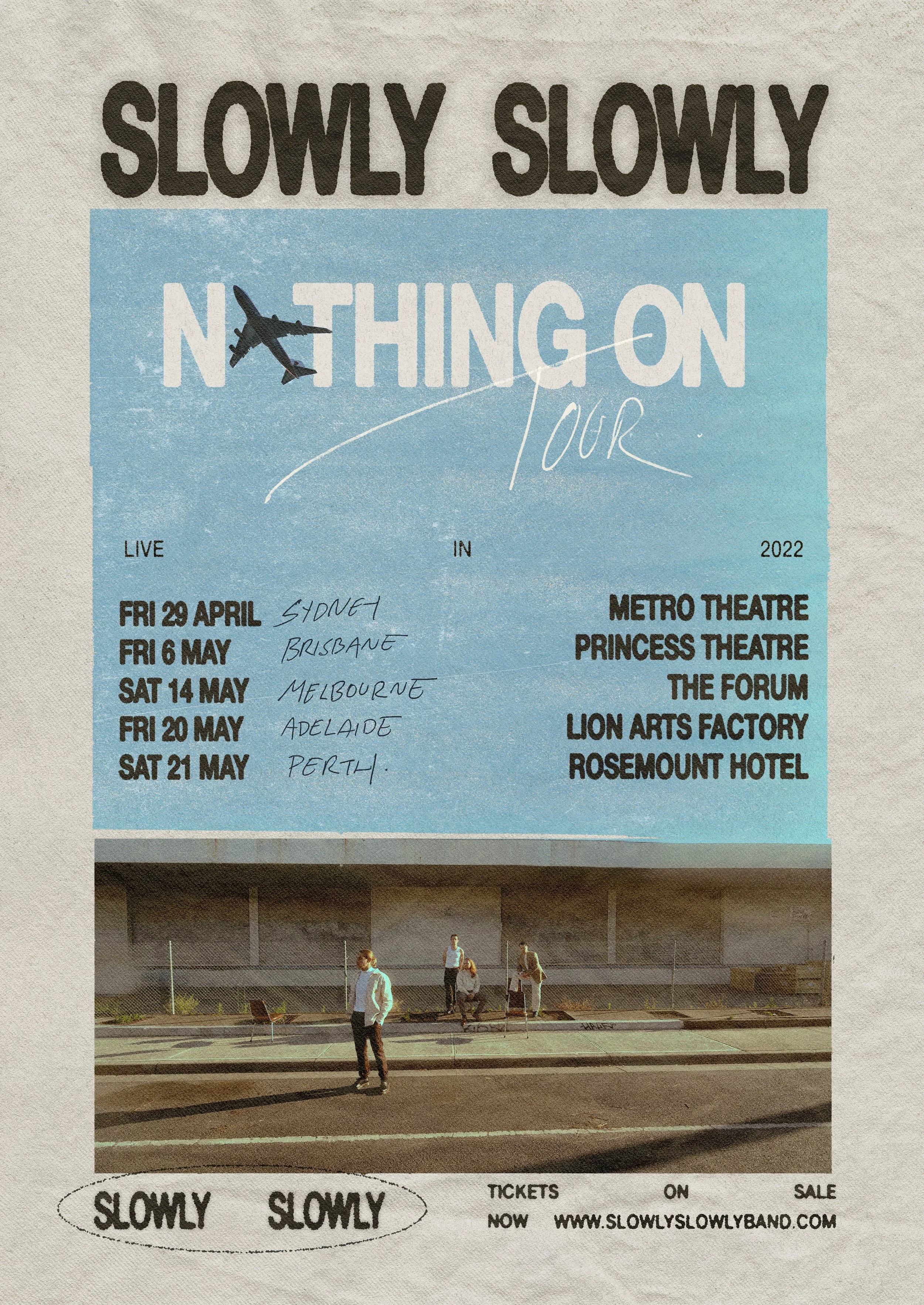 Slowly Slowly will grace their hometown of Melbourne's beloved Forum for the first time, while also stopping by Sydney, Brisbane, Adelaide and Perth. On the festival front, the band also co-headline Tasmania's The Great Escape alongside Jack River, and appear at UNIFY and Full Tilt festivals.