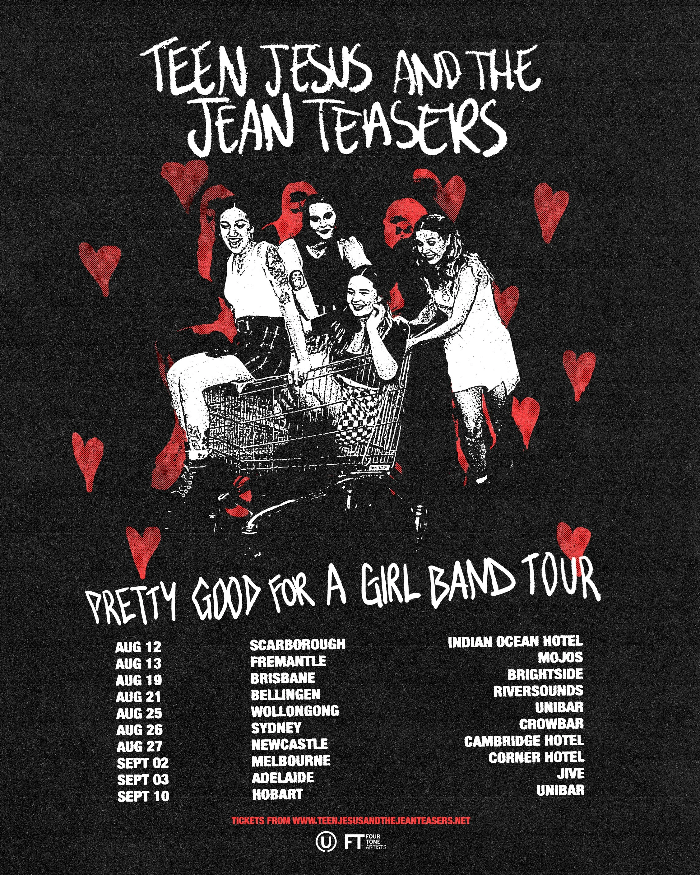 Teen Jesus and the Jean Teasers quickly snapped attention for their teenage ragamuffin image and searingly good garage punk sound, cutting their teeth playing festivals including BIGSOUND, Groovin’ The Moo, Laneway, Falls, Lost Paradise and Spilt Milk, and supporting a slew of Australia’s finest including Polish Club, Alex Lahey, Press Club, WAAX & more. As of now, the band have graduated into an astute group of early twenty-somethings – just as concerned about issues facing today’s women and young people as they are with their loud, badass and completely cool punk sound.