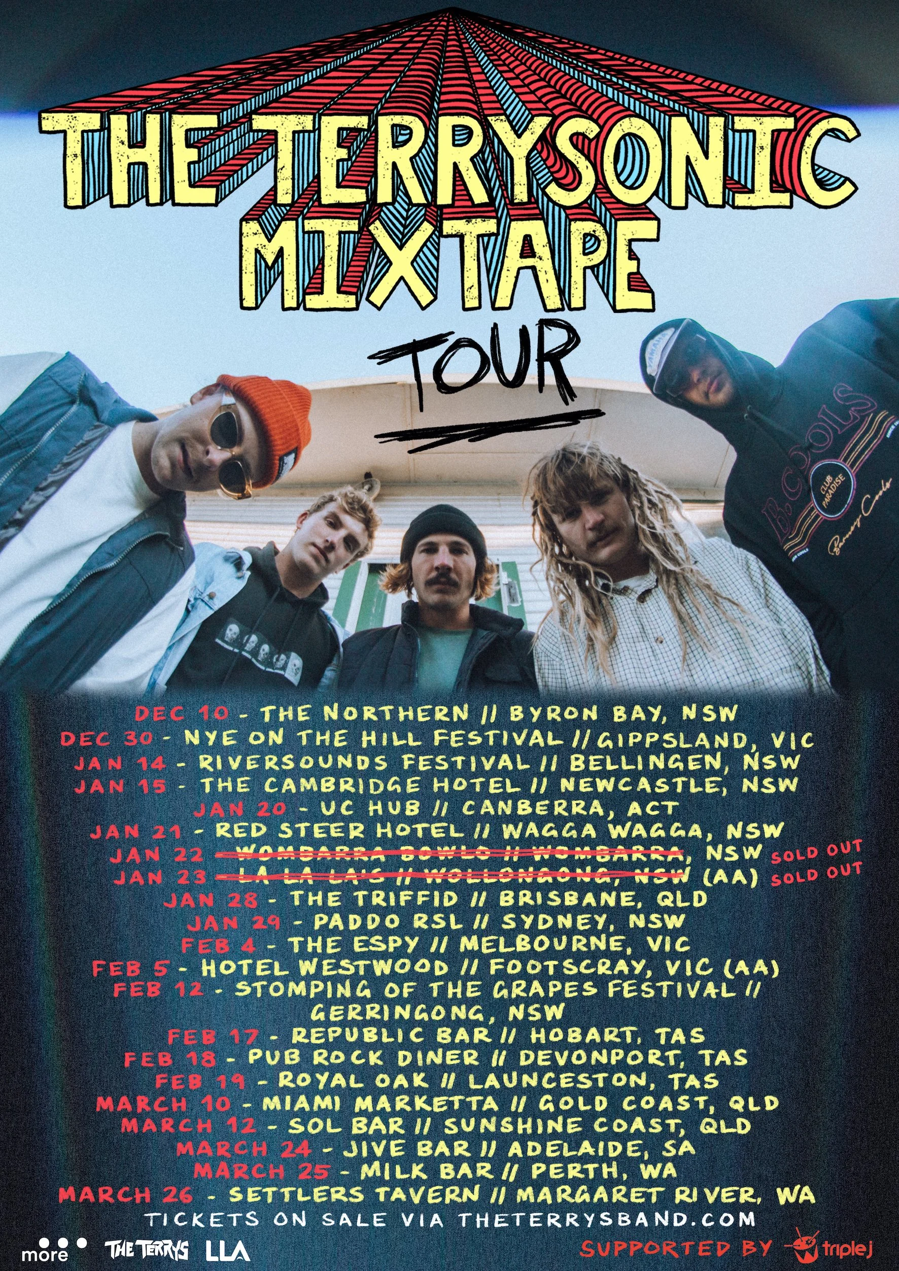 The Terrys' love of homegrown music sees the band naturally drawing inspiration from artists such as The Bungalows, Pond and Skegss with a hint of British influence from bands like Will And The People and Jamie T. With hooky guitars, fast and furious drums and charismatic vocals, The Terrys are on track to be one of the biggest names in the country before too long.